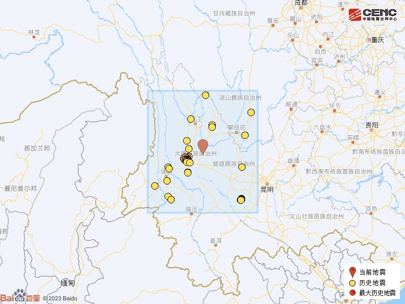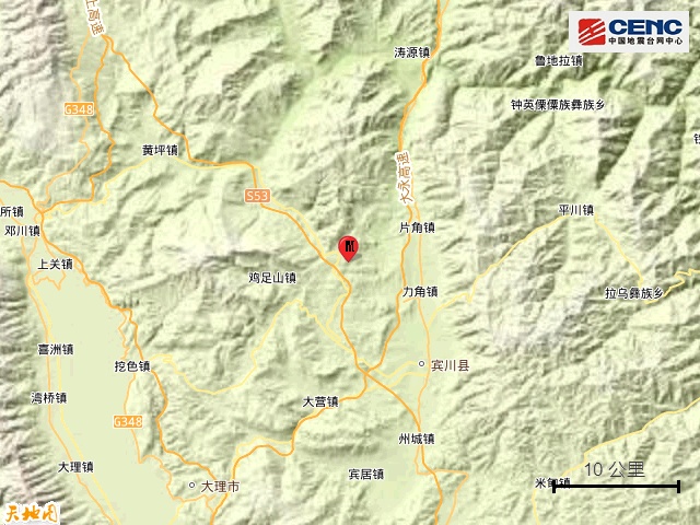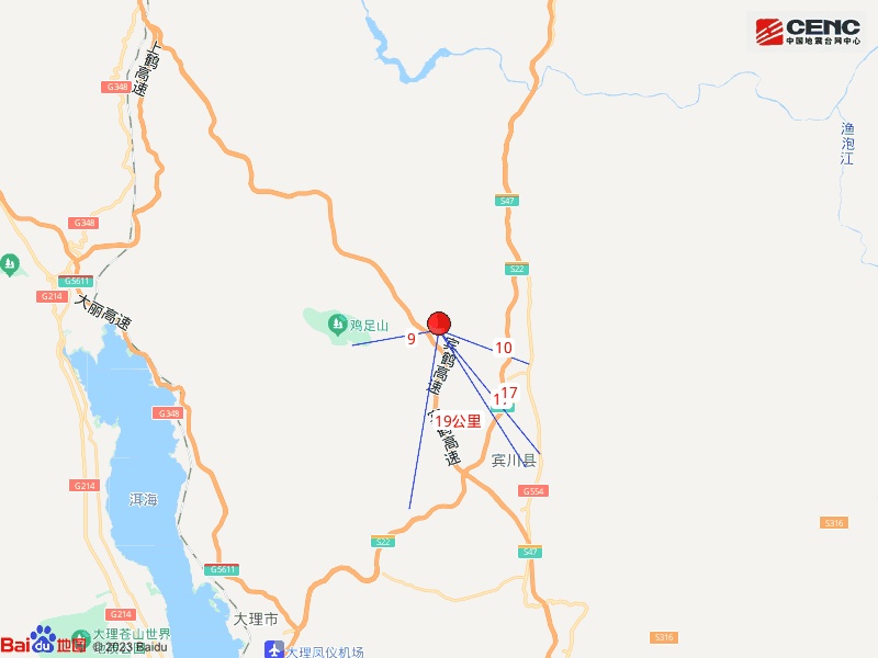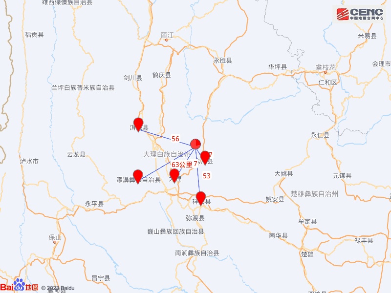 相近县城:震中距宾川县17公里、距大理市37公里、距祥云县53公里、距洱源县56公里、距漾濞彝族自治县63公里,距大理白族自治州46公里,距昆明市244公里。